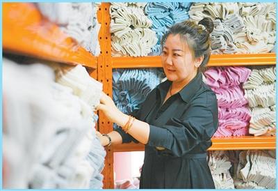 Altantsetseg arranges wool and cashmere at her store in Erenhot, north China's Inner Mongolia Autonomous Region. (People's Daily/Wu Yong)
