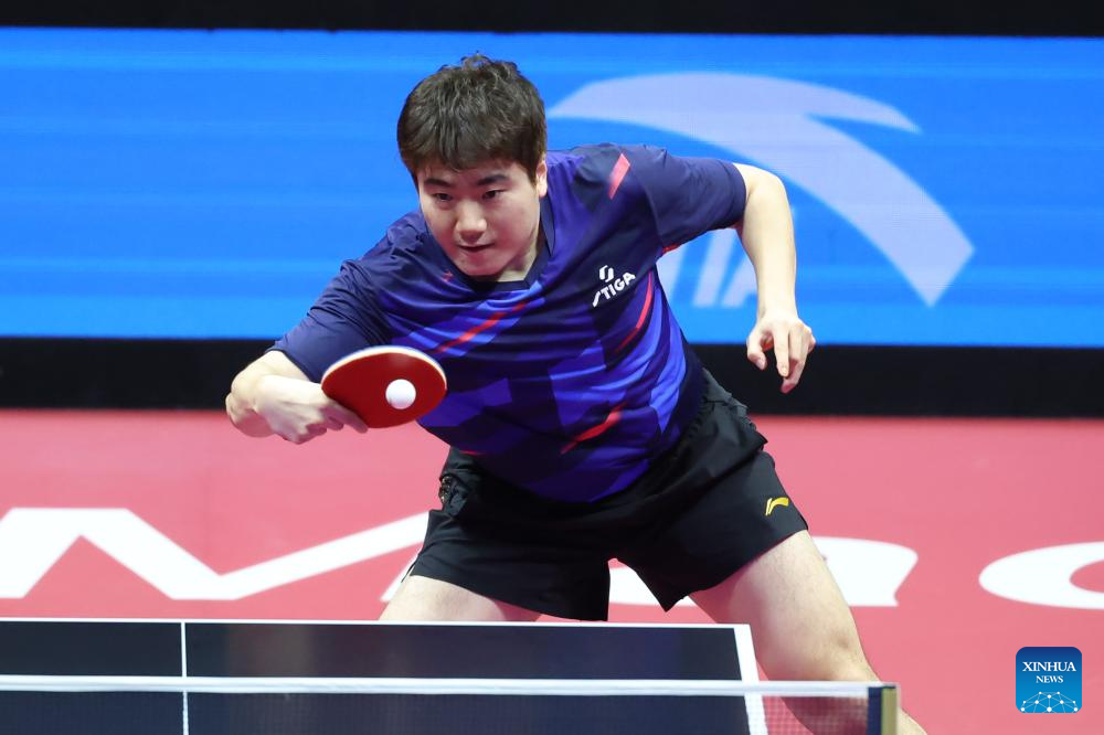 Fan Zhendong of Shanghai hits a return in the match against Liang Jingkun of Hebei during the men's team quarterfinal match of table tennis between Shanghai and Hebei at China's 15th National Games in Macao, south China, Nov. 18, 2025. (Xinhua/Liu Xu)