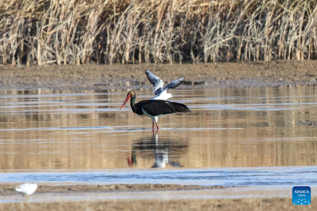 This photo taken on Nov. 12, 2025 shows black storks foraging at a wetland in Heihe Wetland National Nature Reserve in the city of Zhangye, northwest China's Gansu Province. The Hexi Corridor, spanning nearly 1,000 km in China's Gansu Province, is interspersed with oases, rivers, lakes, wetlands, and artificial reservoirs, providing favorable habitats and abundant food resources for migratory birds. (Xinhua/Lang Bingbing)