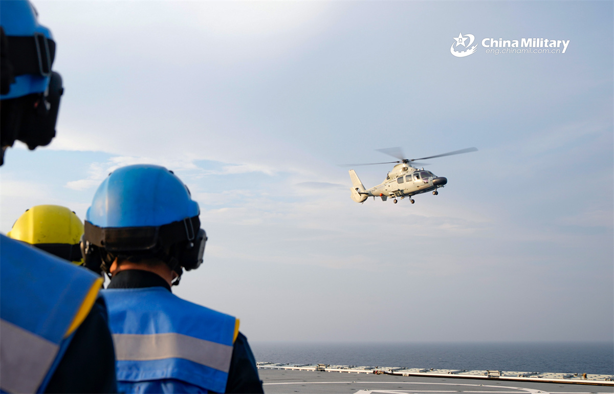 A Z-9D ship-borne helicopter attached to a naval frigate flotilla under the Chinese PLA Eastern Theater Command lifts off from the amphibious assault ship Anhui (Hull 33) during a take-off and landing training exercise. (eng.chinamil.com.cn/Photo by Tang Haoran)