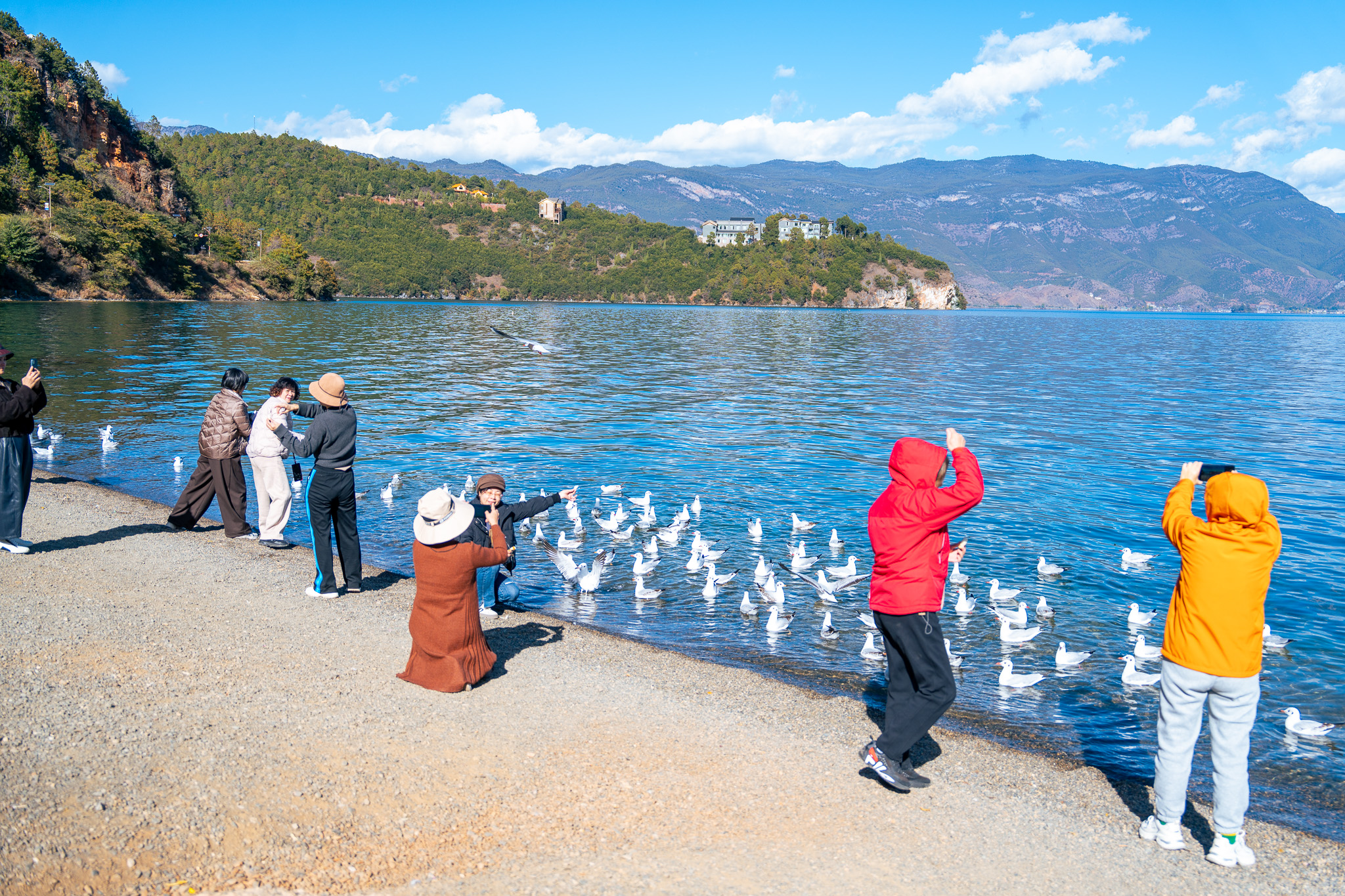 Tourists take photos of black-headed gulls at Lugu Lake in Ninglang Yi Autonomous County, Lijiang city, southwest China's Yunnan Province. (Photo courtesy of the Publicity Department of the Communist Party of China Lijiang Municipal Committee)