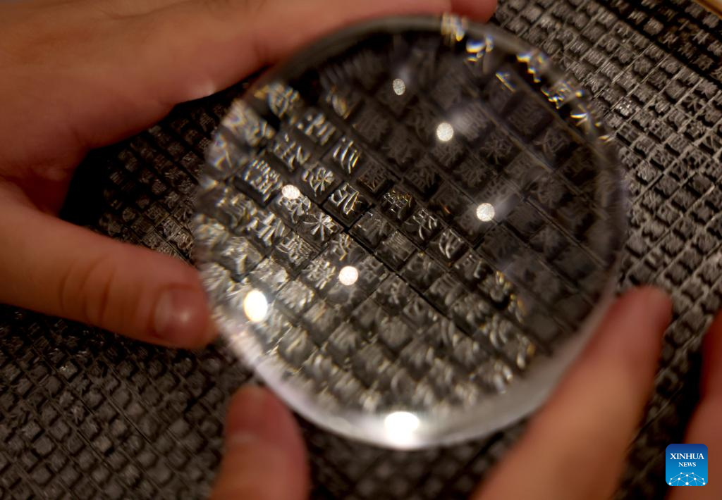A visitor views fine steel Chinese characters for Chinese typewriters at the exhibition "Hanzi of the West, Letters of the East" in London, Britain, Nov. 22, 2025. (Xinhua/Li Ying)