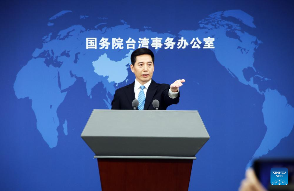 Peng Qing'en, a spokesperson for the State Council Taiwan Affairs Office, gestures at a press conference in Beijing, capital of China, Nov. 26, 2025. (Xinhua/Pan Xu)