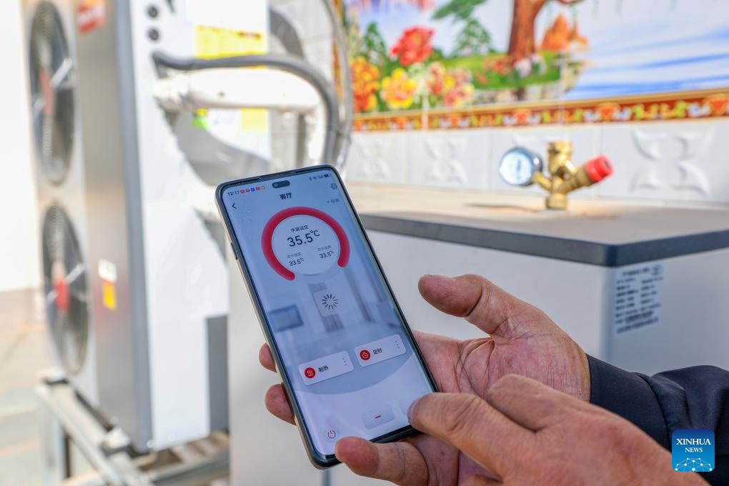 A villager demonstrates a mobile app, with which users can adjust the water temperature of an air-source heat pump heating system, in Yuanyi Village of Tongxin County, Wuzhong City, northwest China's Ningxia Hui Autonomous Region, Nov. 27, 2025. Located in the arid central region of Ningxia, Tongxin County has enabled 28,000 rural households to switch to clean heating through a rural clean heating renovation program and a supporting "coal-to-electricity" project. (Xinhua/Yang Zhisen)