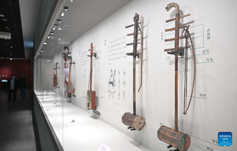 A visitor (R) learns to play a horse-head fiddle during an exhibition themed on various music cultures along the ancient Silk Road at Guangzhou Maritime Museum in Guangzhou, south China's Guangdong Province, Nov. 29, 2025. The exhibition kicked off here on Saturday, showcasing 143 ancient musical instruments from countries along the Silk Road. The exhibition, which will run until April 6, 2026, presents the historical context and artistic integration of musical instruments in the cultural exchanges between the East and the West. (Xinhua/Deng Hua)