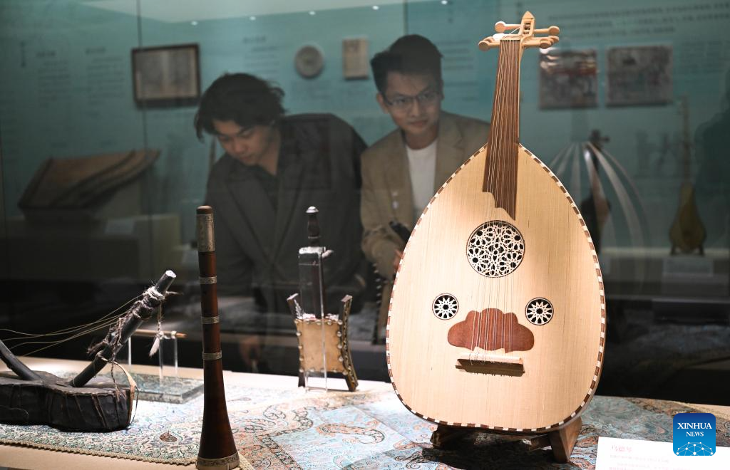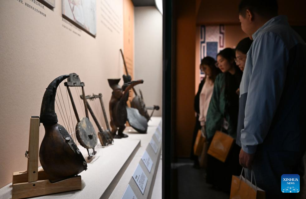 Visitors look at musical instruments during an exhibition themed on various music cultures along the ancient Silk Road at Guangzhou Maritime Museum in Guangzhou, south China's Guangdong Province, Nov. 29, 2025. The exhibition kicked off here on Saturday, showcasing 143 ancient musical instruments from countries along the Silk Road. The exhibition, which will run until April 6, 2026, presents the historical context and artistic integration of musical instruments in the cultural exchanges between the East and the West. (Xinhua/Deng Hua)