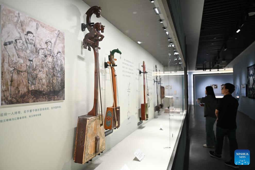 Musical instruments are on display during an exhibition themed on various music cultures along the ancient Silk Road at Guangzhou Maritime Museum in Guangzhou, south China's Guangdong Province, Nov. 29, 2025. The exhibition kicked off here on Saturday, showcasing 143 ancient musical instruments from countries along the Silk Road. The exhibition, which will run until April 6, 2026, presents the historical context and artistic integration of musical instruments in the cultural exchanges between the East and the West. (Xinhua/Deng Hua)