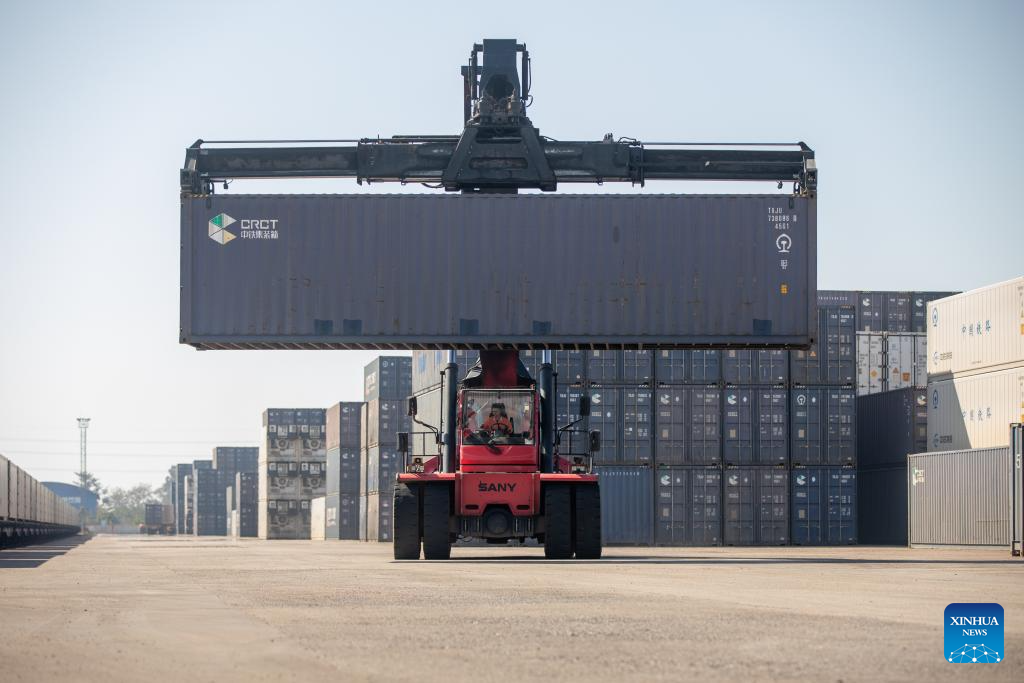 Workers conduct container hoisting operations at the Vientiane South Station on the China-Laos Railway in Vientiane, capital of Laos, Nov. 29, 2025. (Photo by Kaikeo Saiyasane/Xinhua)