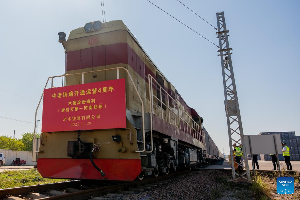 VIENTIANE, Nov. 30 (Xinhua) -- A container train carrying 1,000 tons of cassava starch departed from Vientiane South Station on the China-Laos Railway on Saturday, and is expected to arrive in Zhengzhou, capital of central China's Henan Province, in 80 hours, marking the first time that cassava starch from Laos has been exported to China via a full train consignment.