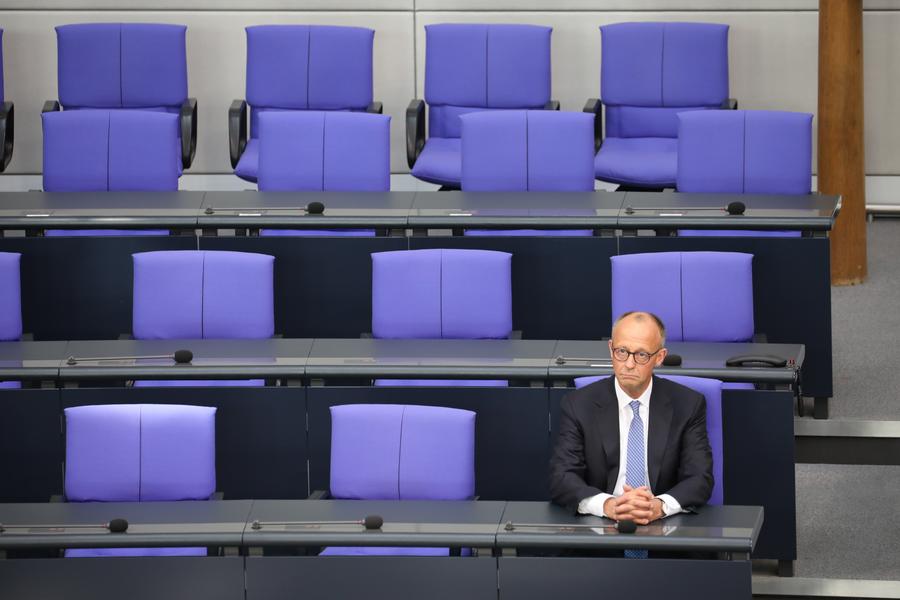 Friedrich Merz, leader of Germany's conservative Christian Democratic Union (CDU), sits in the chancellor's seat after taking the oath at the Reichstag building in Berlin, Germany, on May 6, 2025. (Xinhua/Du Zheyu)