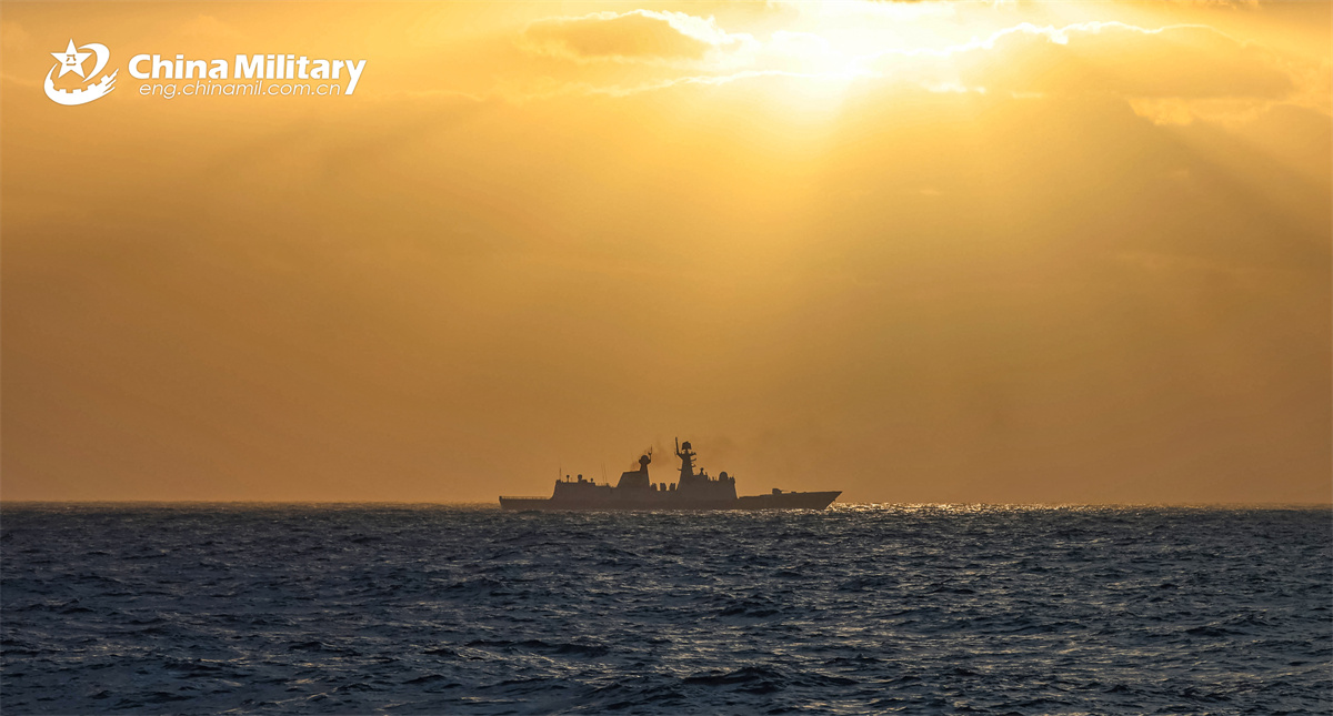 A warship attached to a frigate flotilla under the Chinese PLA Navy bathes in sunset glow during a maritime training exercise on November 27, 2025. (eng.chinamil.com.cn/Photo by Yang Haifan)
