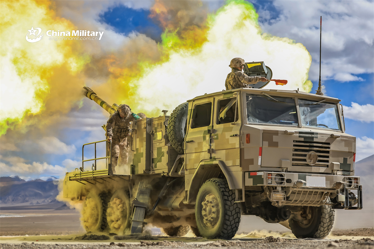 PCL-09 122mm self-propelled artillery (SPA) vehicle attached to an army unit under the Chinese PLA Xinjiang Military Command erupts in blinding flash at the mock targets during a live-fire training exercise. (eng.chinamil.com.cn/Photo by Qiang Chuxin)