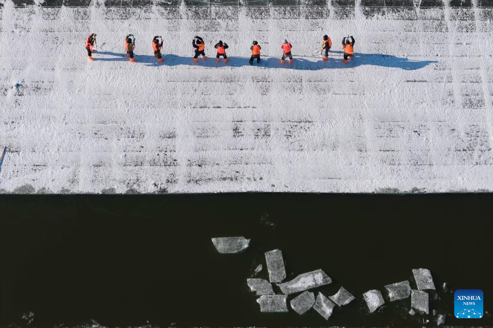 Workers collect ice at the Harbin section of Songhua River in Harbin, northeast China's Heilongjiang Province, Dec. 9, 2025.