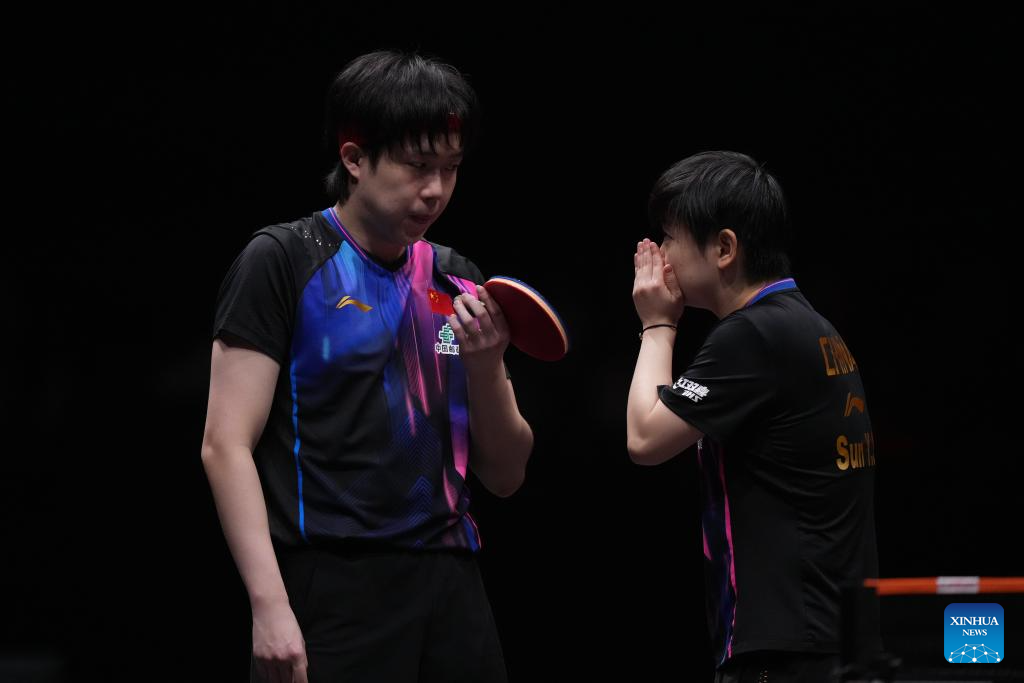 Wang Chuqin (L)/Sun Yingsha of China discuss during the mixed doubles quarterfianl match between Wang Chuqin/Sun Yingsha of China and Matsushima Sora/Harimoto Miwa of Japan at the WTT Finals Hong Kong 2025 in Hong Kong, south China, Dec. 13, 2025. (Xinhua/Lui Siu Wai)