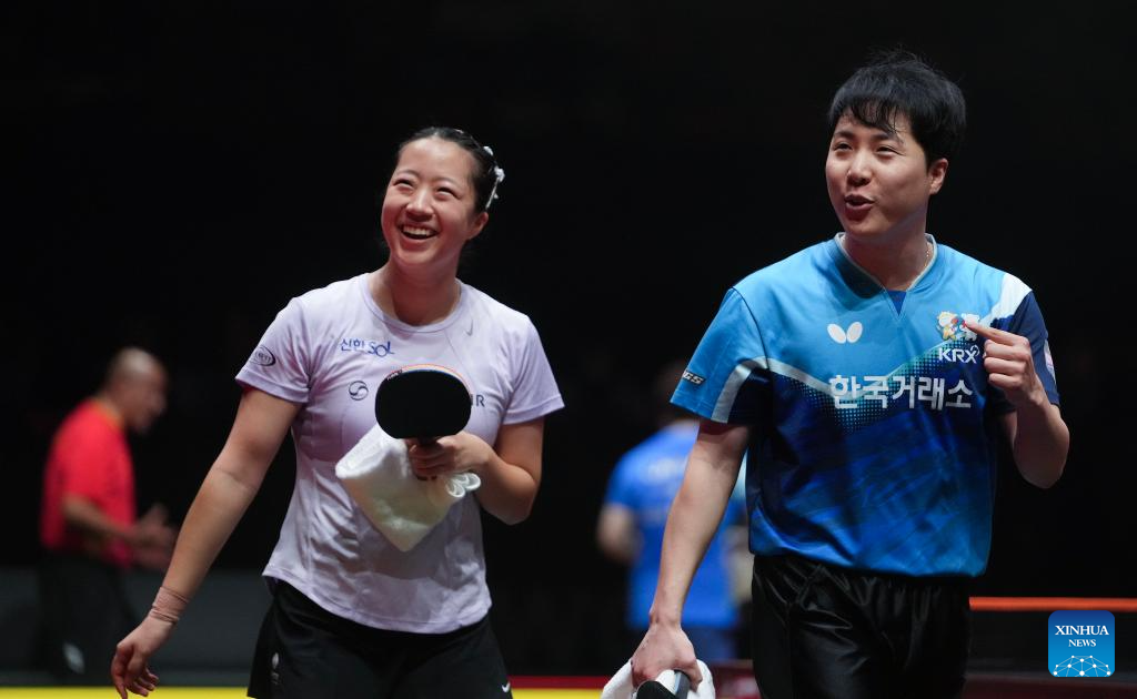 Lim Jonghoon (R)/Shin Yubin of South Korea celebrate after the mixed doubles quarterfianl match between Lin Shidong/Kuai Man of China and Lim Jonghoon/Shin Yubin of South Korea at the WTT Finals Hong Kong 2025 in Hong Kong, south China, Dec. 13, 2025. (Xinhua/Lui Siu Wai)